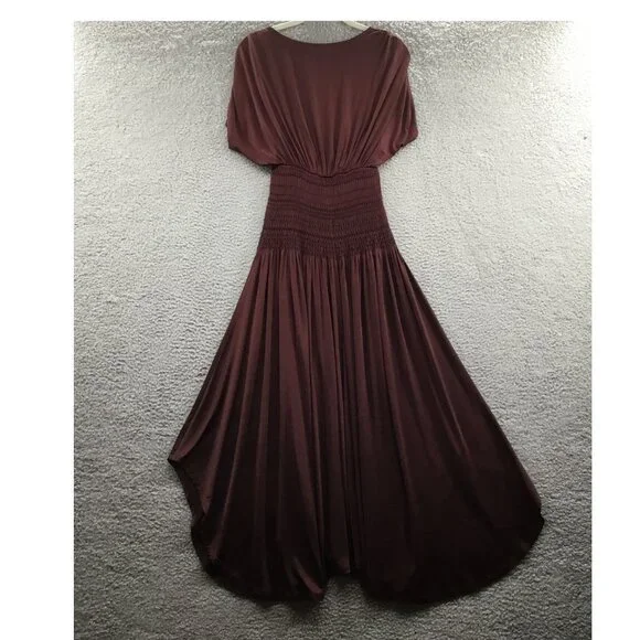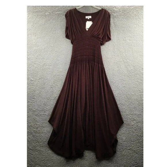 A.L.C. Demi Smock Detail Dress Bitter Chocolate SNew with tag.Flaw: stitching at bottom of v-neck is broken (see last photos).Plunging v-neckShort sleeves; cinched shouldersSmocked waistPartially linedSlip-onSolid colorwayDry cleanAcetate, ElastaneApprox. measurements laid flat -Chest (underarm to underarm): 17"Waist: 11.5"Offers welcomedVacation, holiday, cruise, resort, summer, beach, formal, occasion, party, function, dinner, event, date night, club, urban