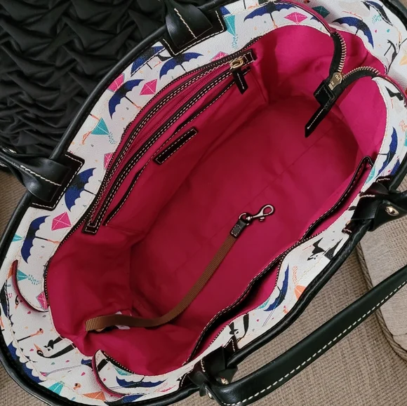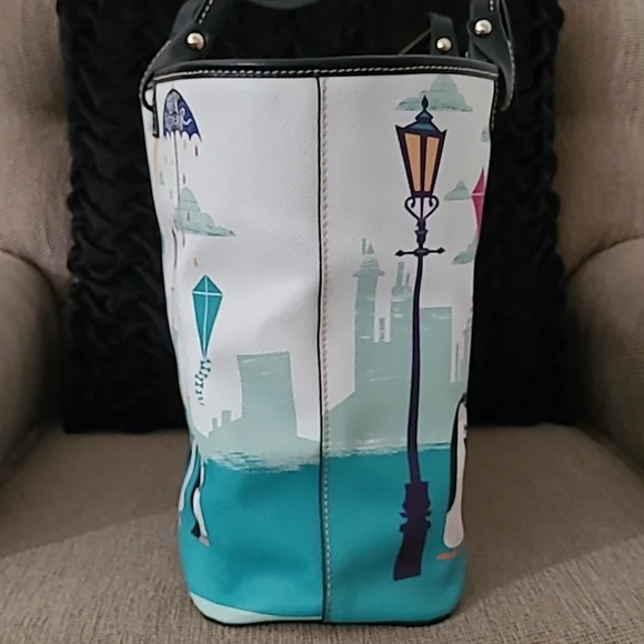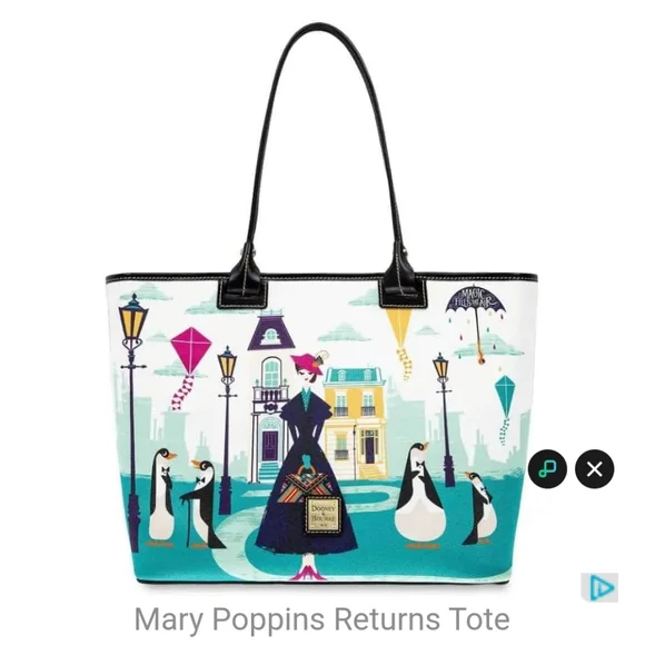 Dooney & Bourke Disney Mary Poppins Returns tote bag 2018. Mary Poppins with penguins screen art on coated cotton. See last several photos for online description and specs. Authentic and in excellent condition. Purchased at Disneyland Theme Park Anaheim California. Please see all photos which were taken in natural light.