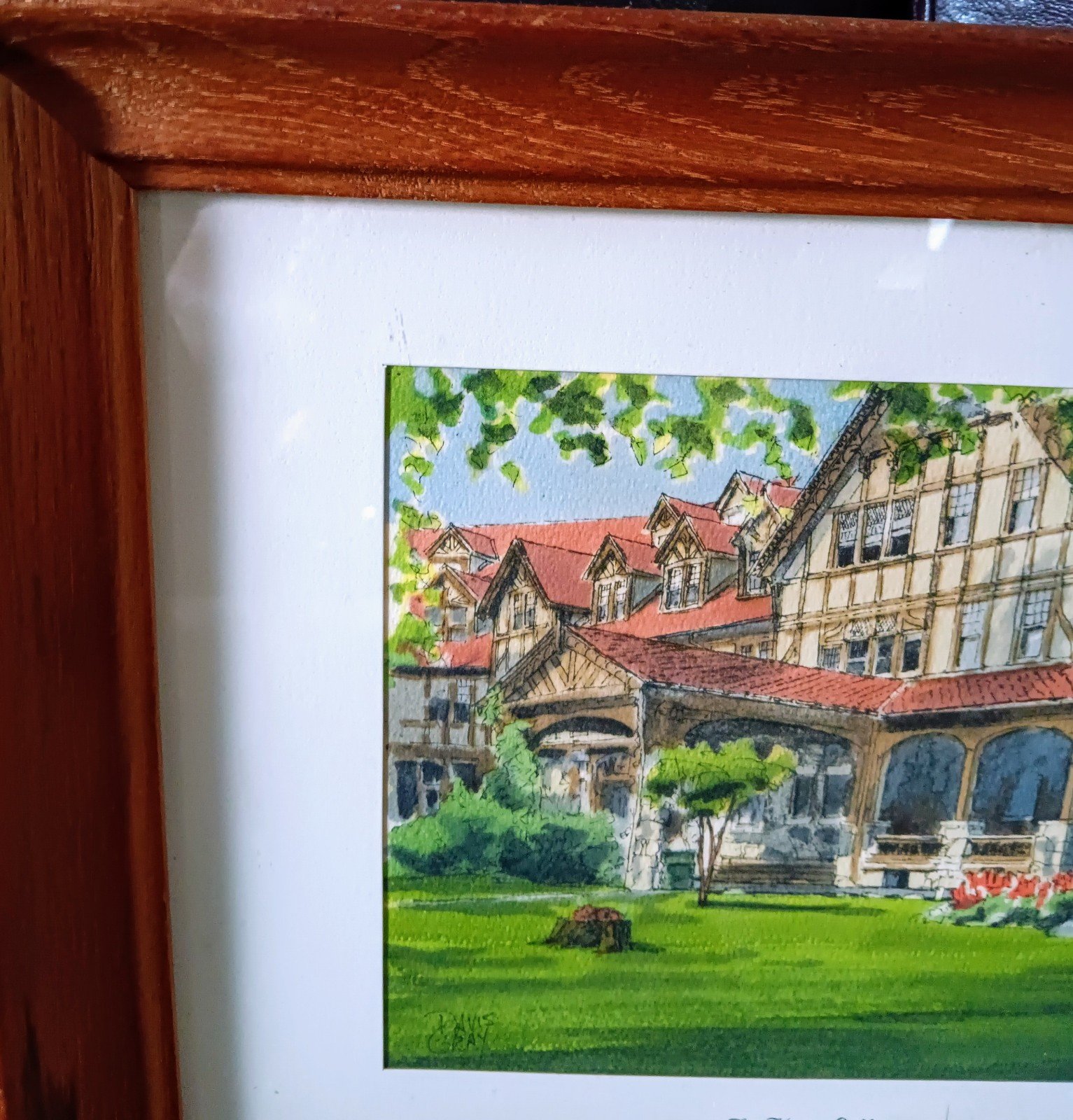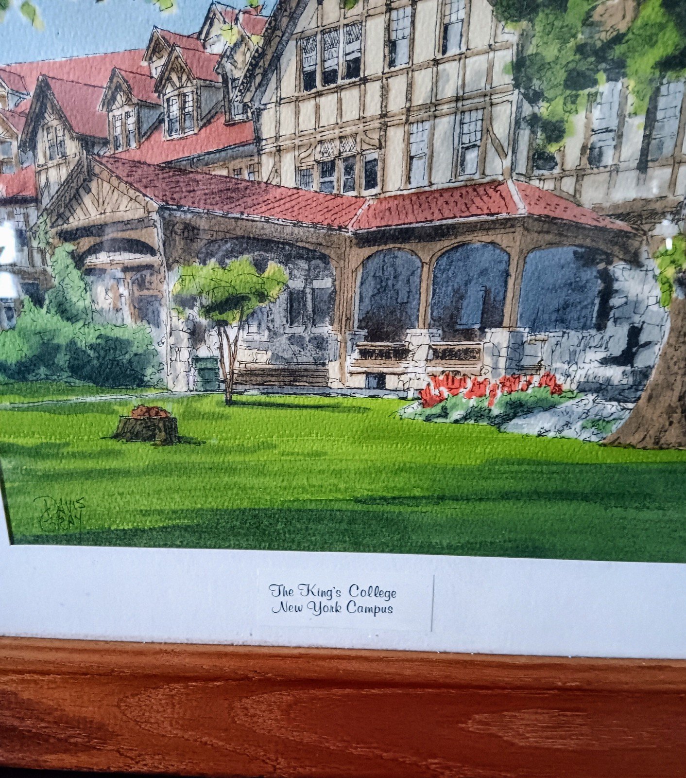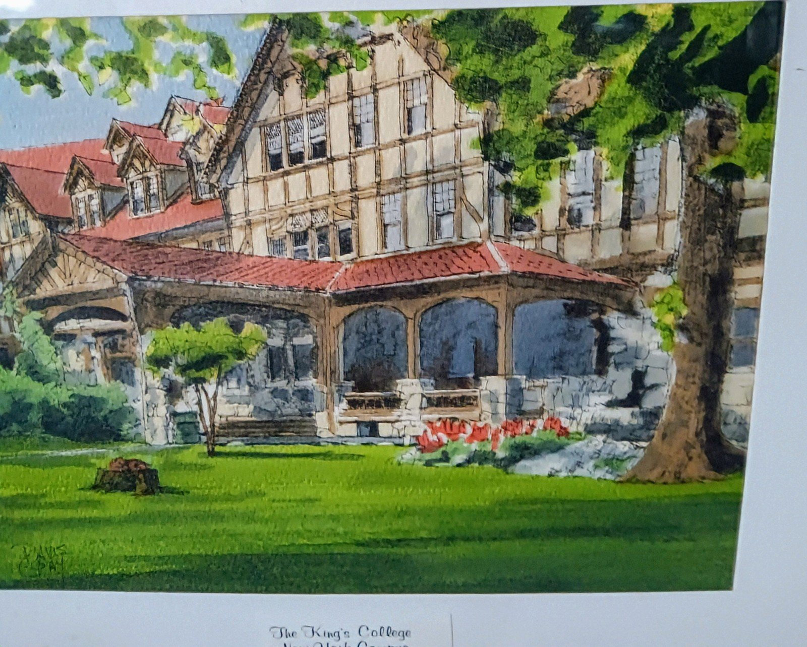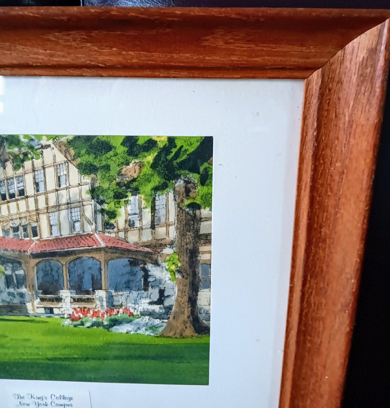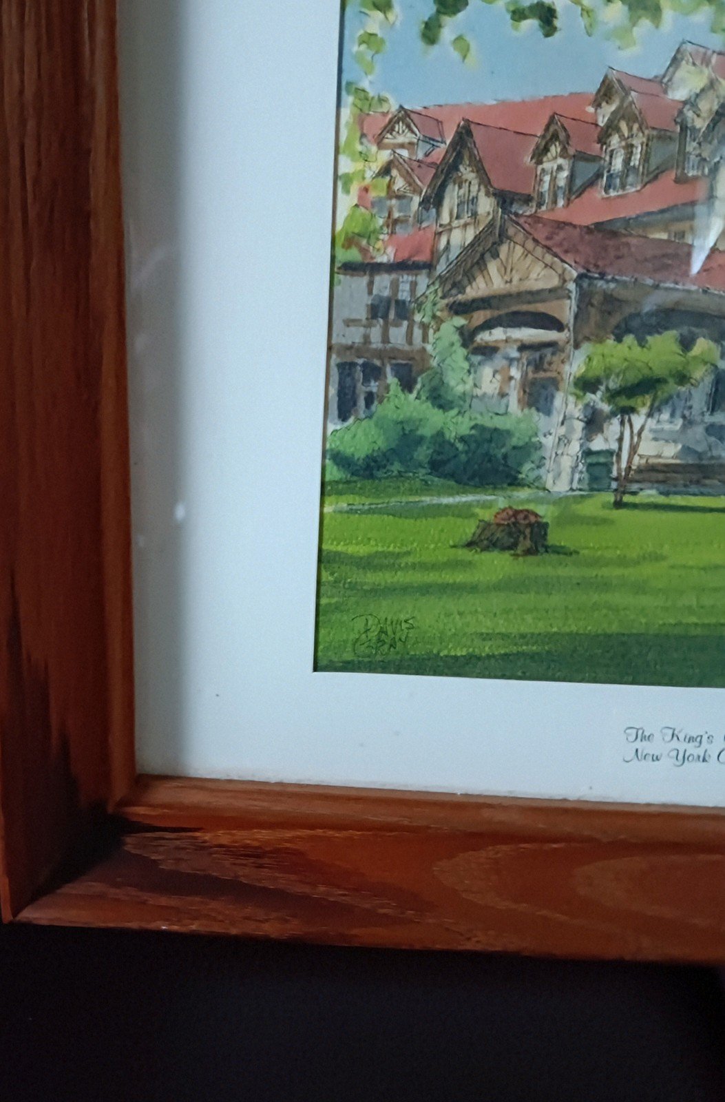 Title: The Kings College New York Campus. Signed bottom left. Frame measures 13 and / 3/8 inches wide by 16 and 1l2 inches high. Print measures 9 by 7 and 1l2. Some discoloration bottom left side of frame (See closeups) Print is very colorful and bright. The frame is very solid and made of wood.
