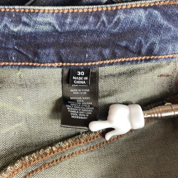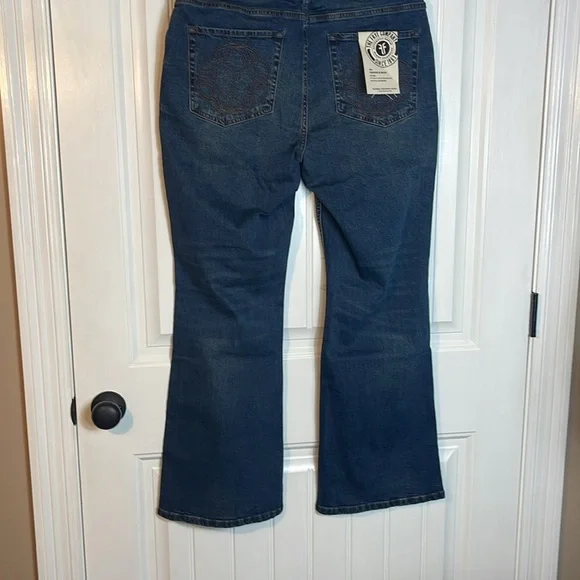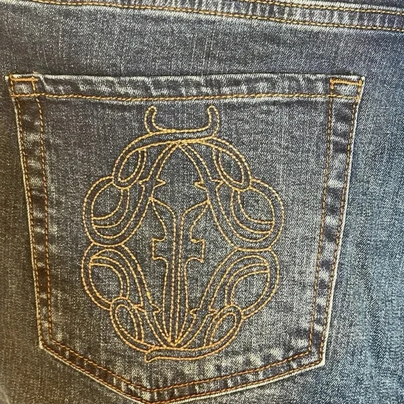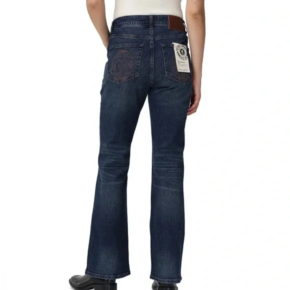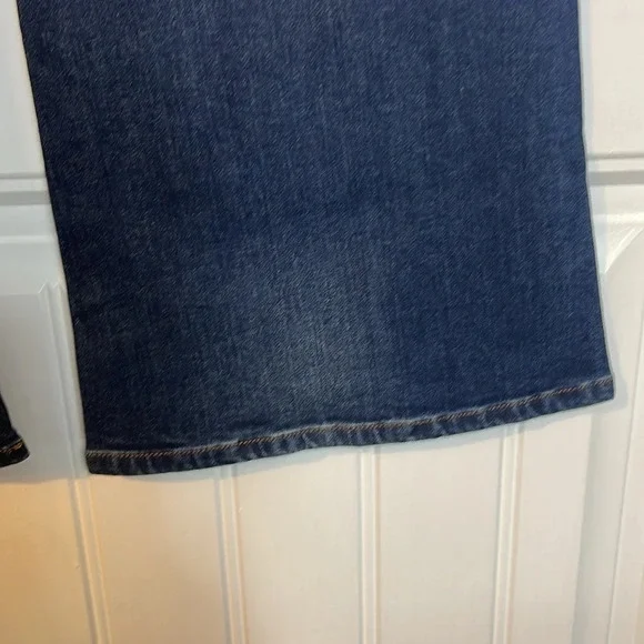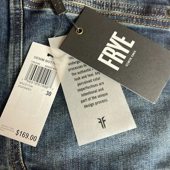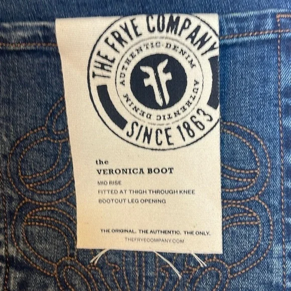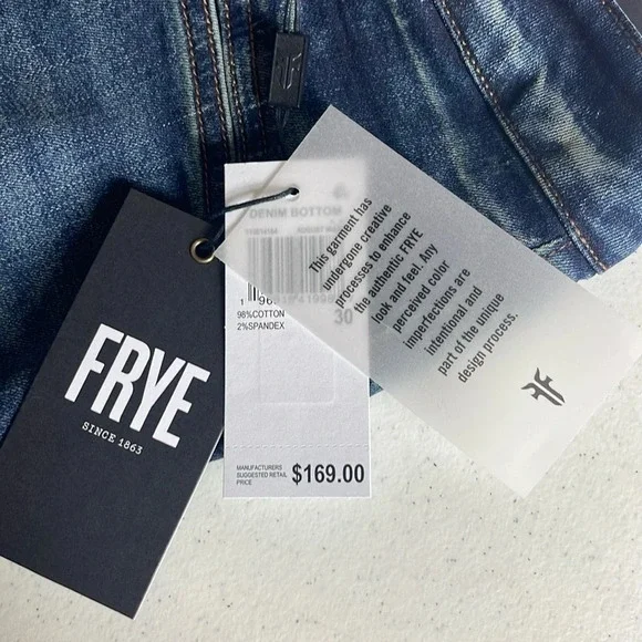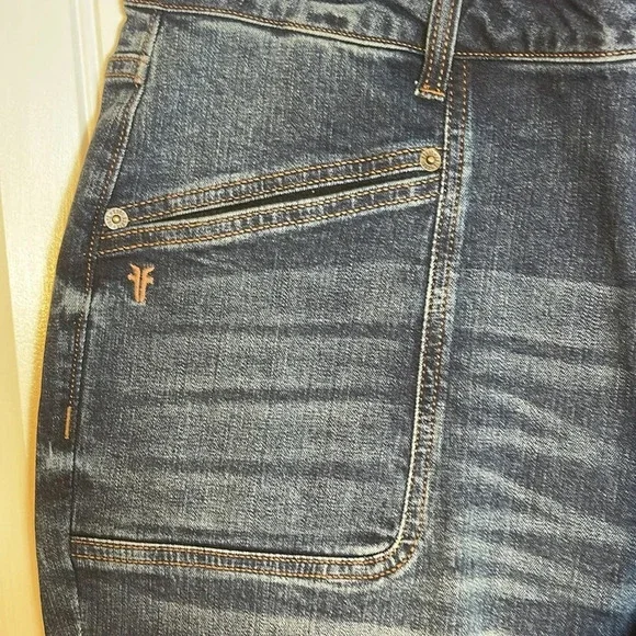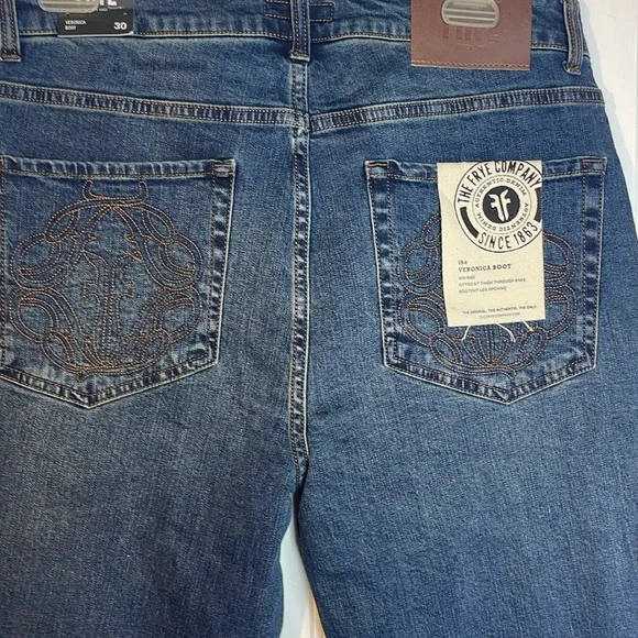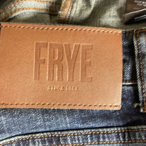 Frye takes on bootcut jeans, adding utility-inspired pockets in front and embroidered patch pockets in back. Imported• Whiskering details at hips and back legs• Utility pockets at front; embroidered patch pockets at back• Zipper and button closure at front; belt loopsSize 30 Machine washable• Cotton/spandex Measurements Waist 17. inseam 30 1/2 Hips 21” Leg 11” Rise 12” (these jeans run large)