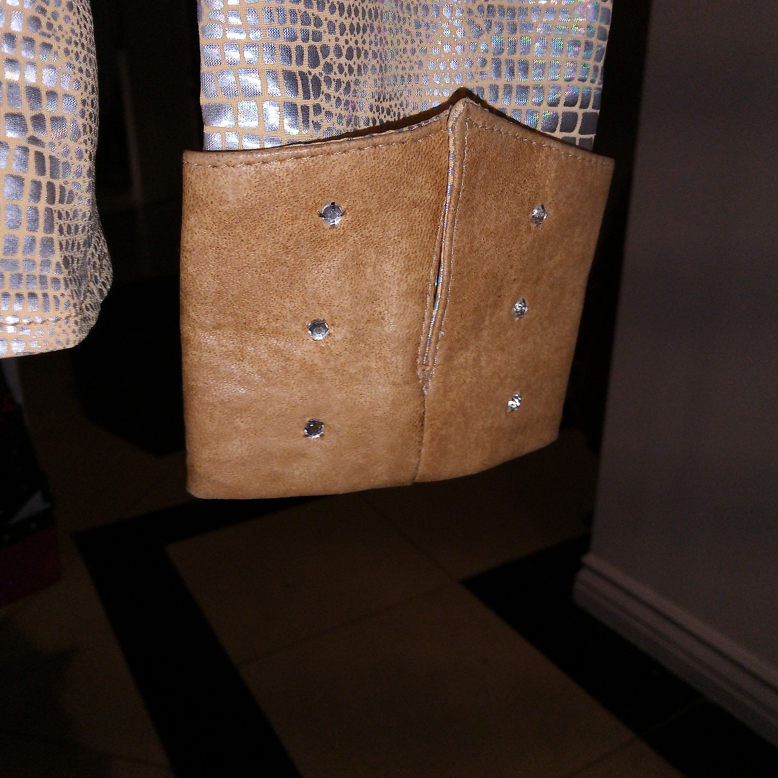 This is a one of a kind piece lamb skin suede cuff and collar on a beautiful print breathable fabric 18 crystals on each cuff and loaded crystals on collar set with legs and on the down trim crystals set with eyelids together it pairs beautifully sample concept piece words can't describe the beauty in this blouse very soft suede