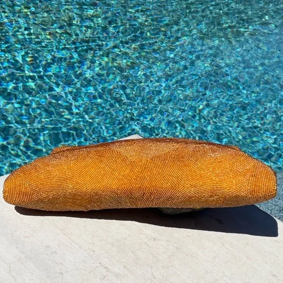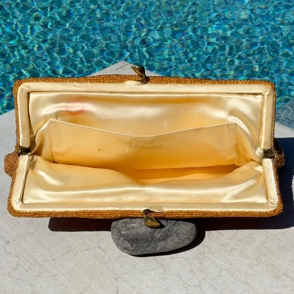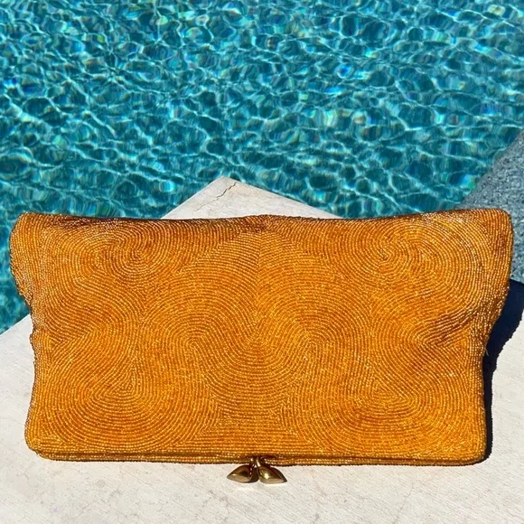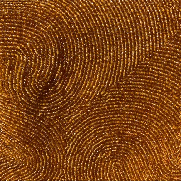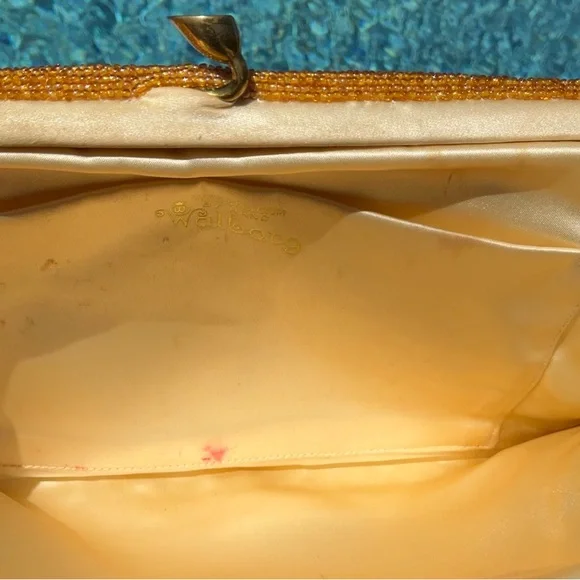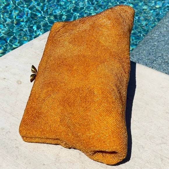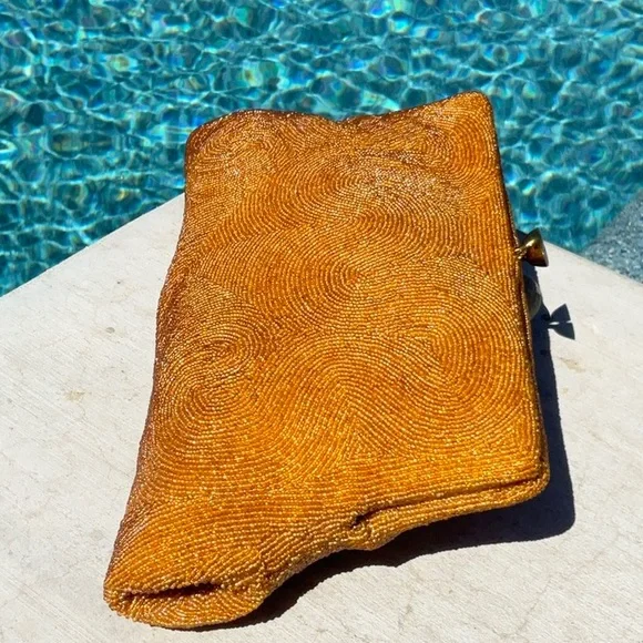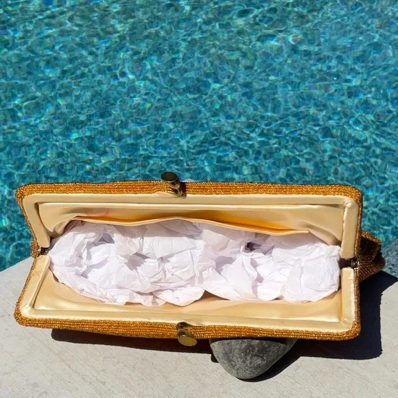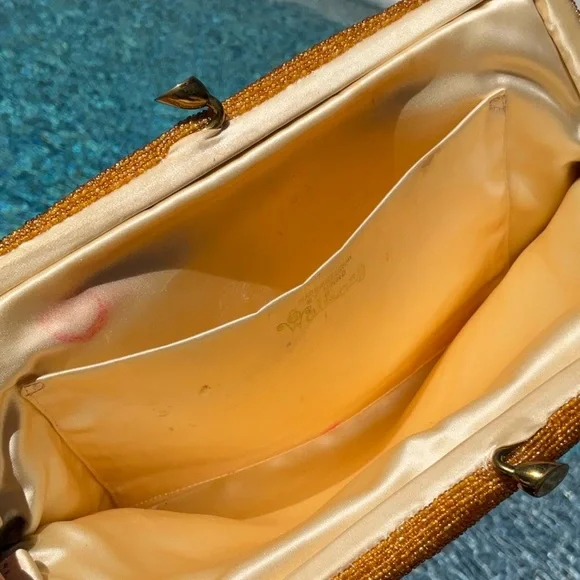 Another of my favorites, Golden Seed Beads cover this beautiful vintage bag. Different shades of golden colored glass seed beads. I’m 100% sure this one has absolutely no missing beads well taken care of for the age. Golden satin interior with one pocket. This bag also has some stains and marks on the inside none bleed or can be seen from the outside. MeasurementsHeight 5.5”Width 9” At topWidth 10.5” At bottom